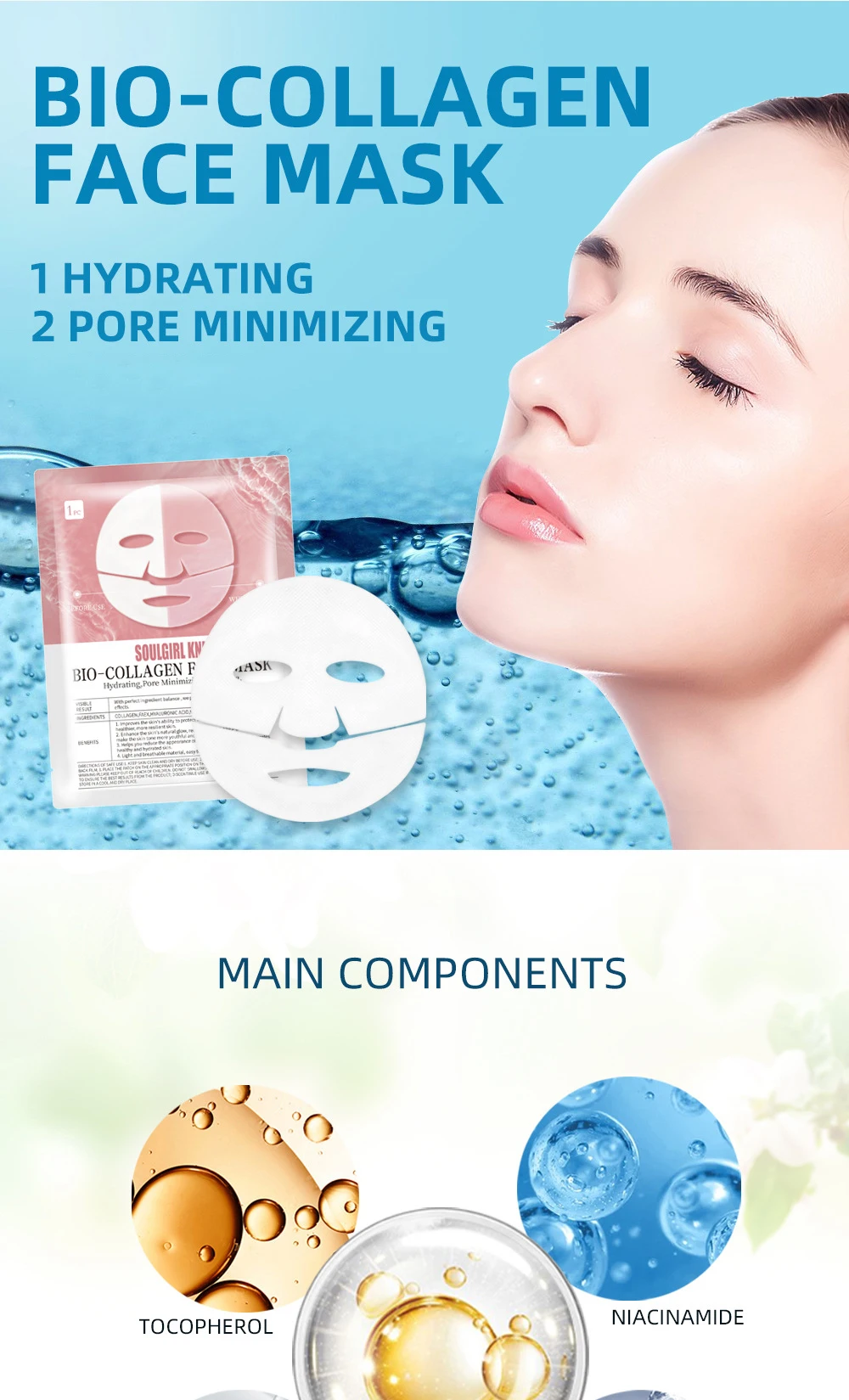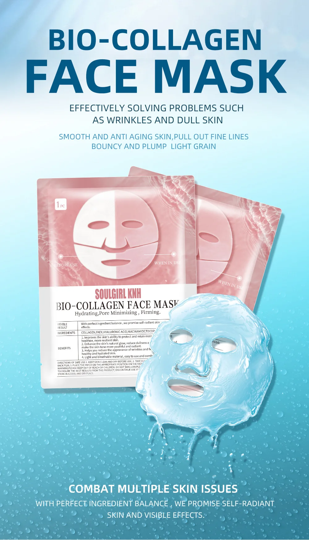 1.After Cleaning The Face, Use Collagen Makeup Water To Straighten The Skin, Take Out The Upper And Lower Separated Facial Mask, And Tear Offthe Film
